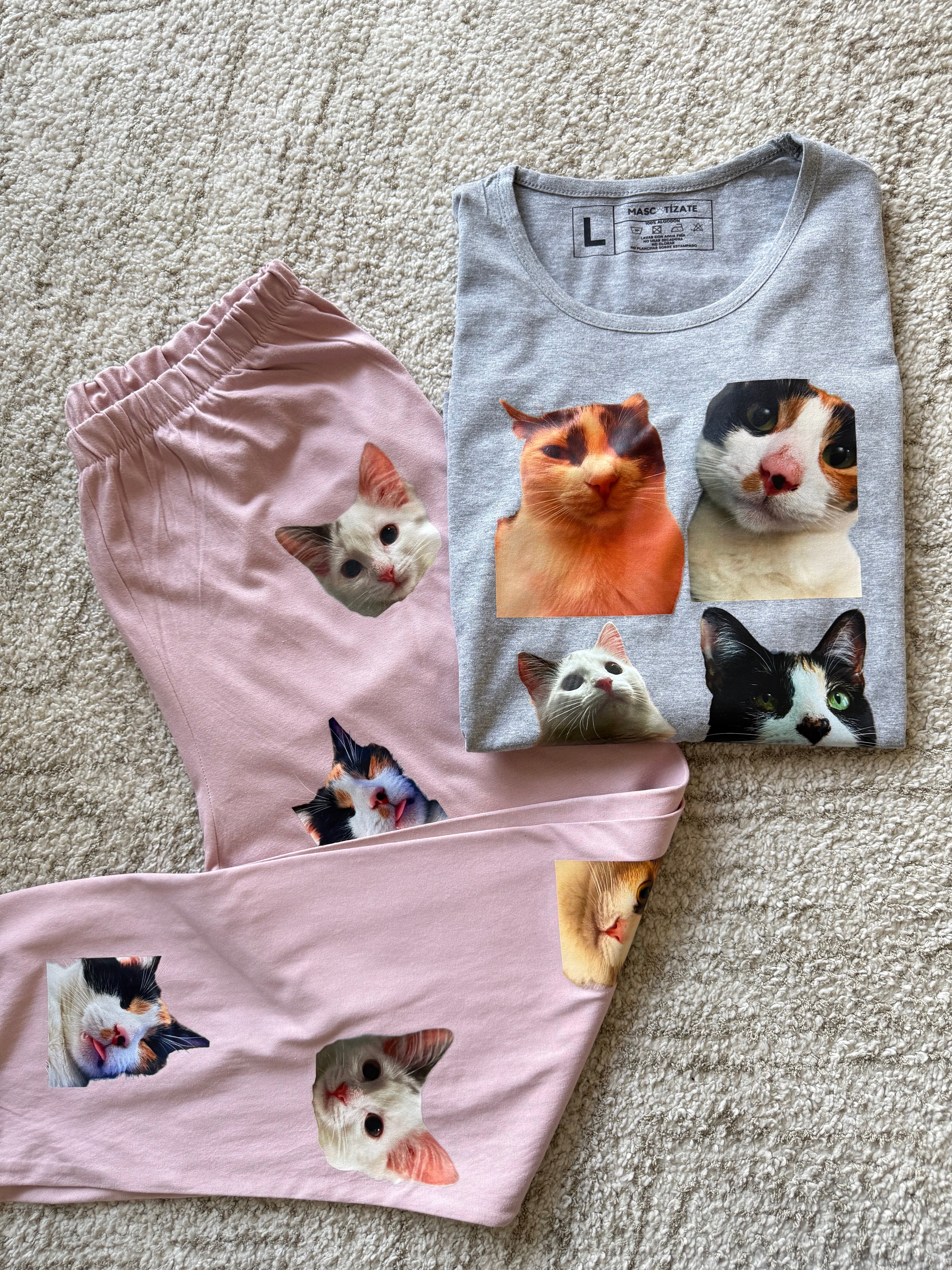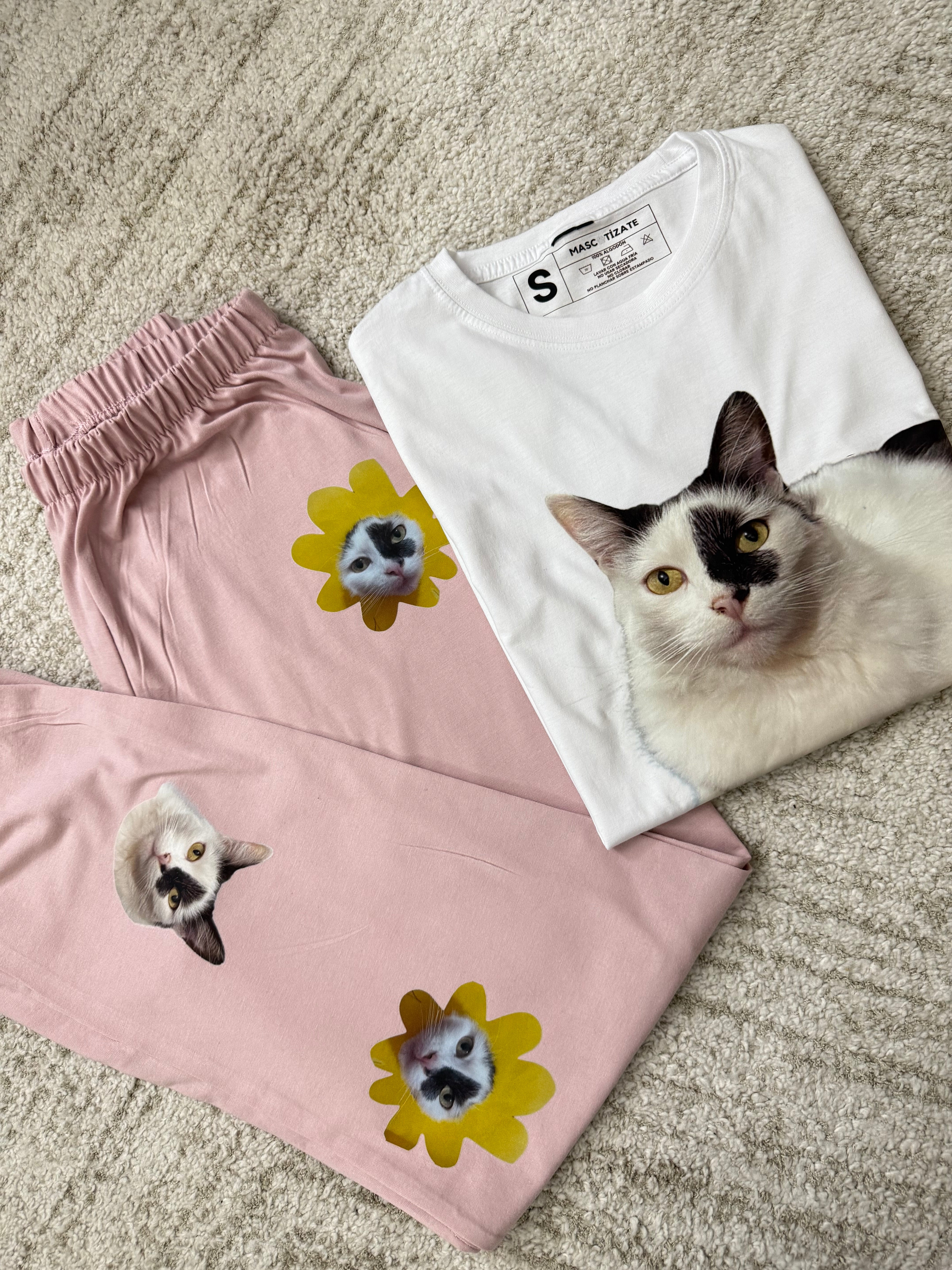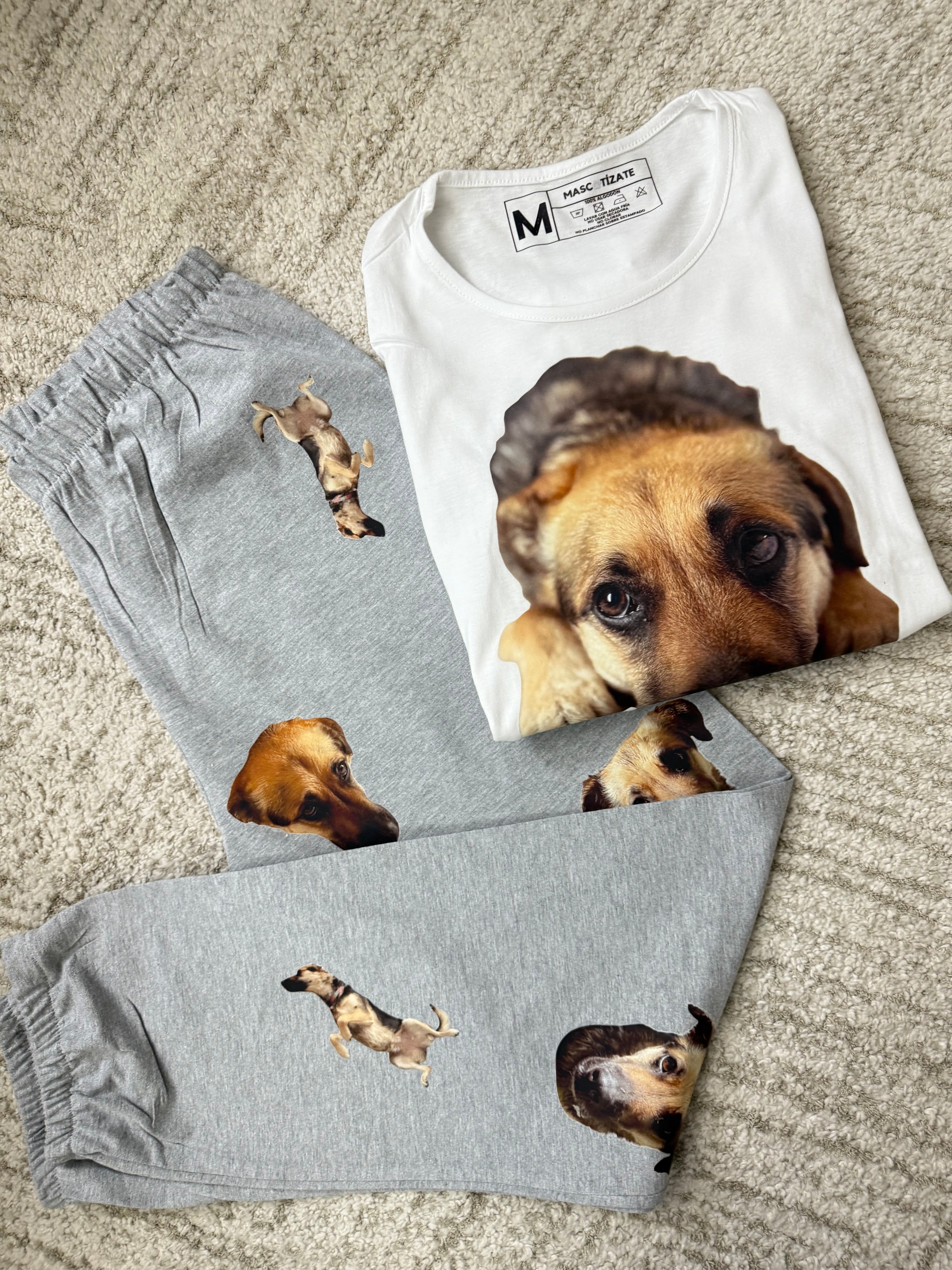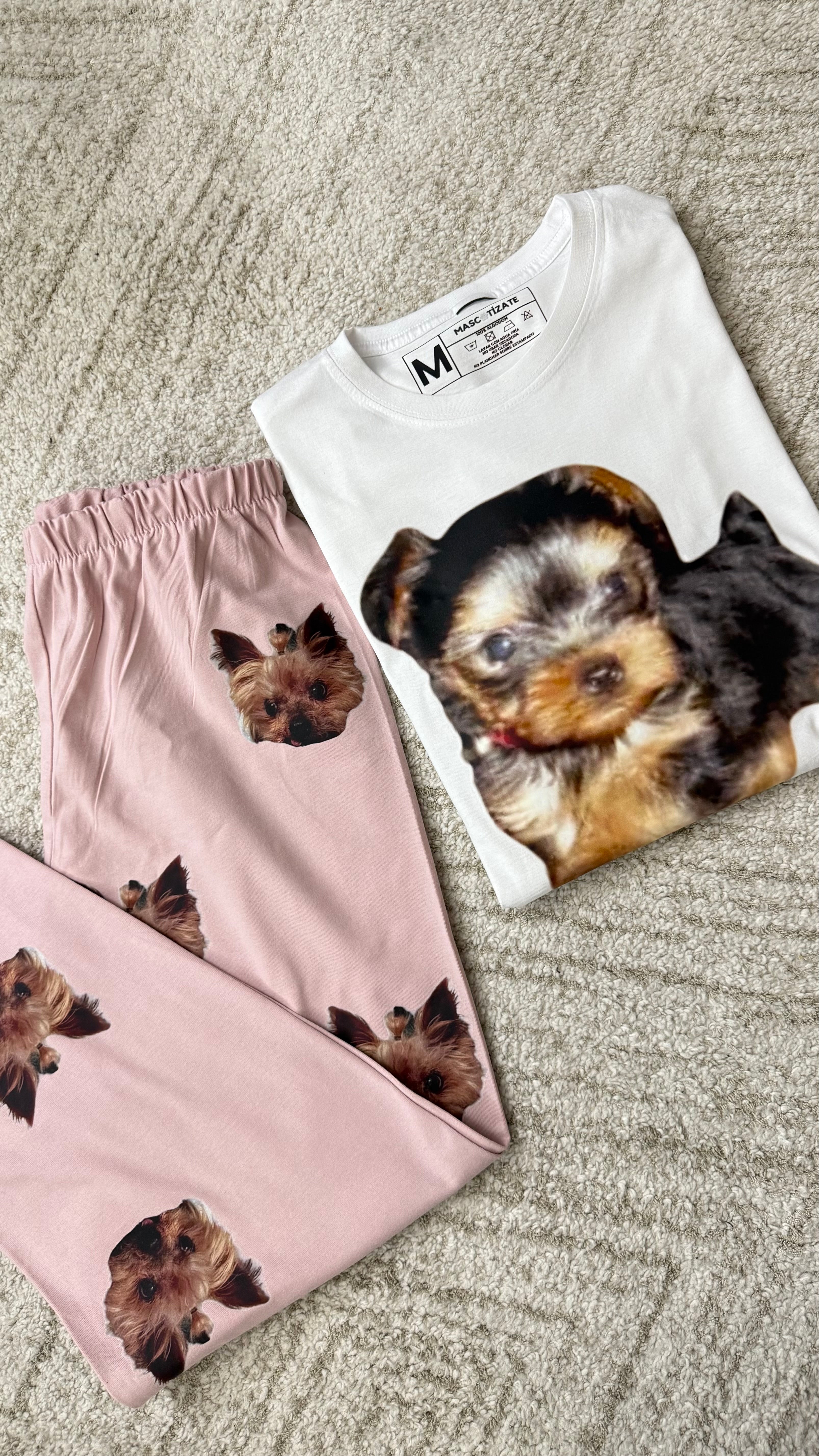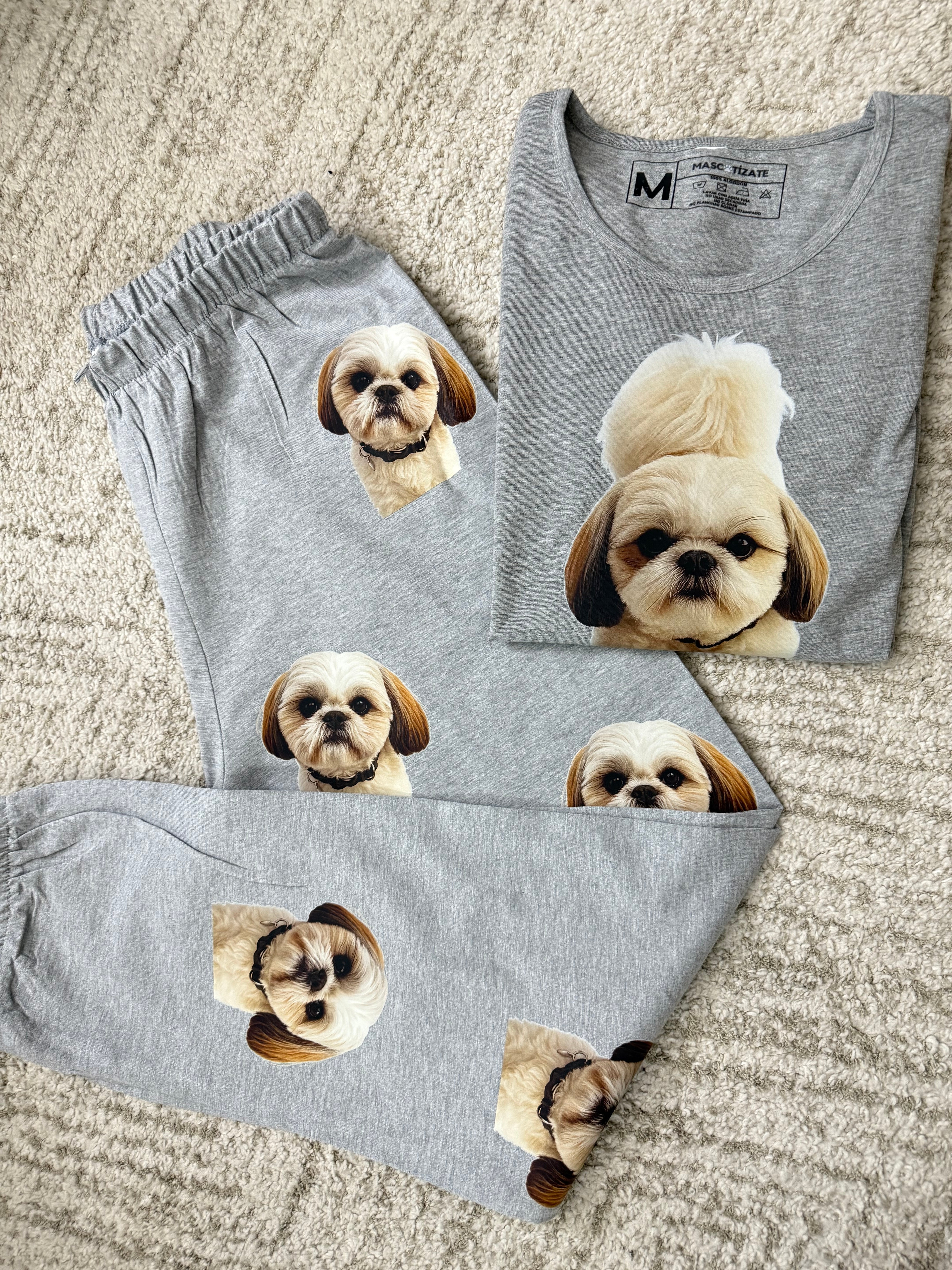 La polera la puedes mascotizar (personalizar) con la foto de tu mascota(s) y/o una frase, tamaño carta aproximadamente. El pantalón se estampara con la foto en un tamaño más pequeño, puede ser la misma foto que la polera o una distinta.